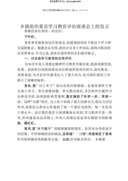 【七哥公文】2025年:【七哥公文】乡镇组织委员贯彻中央八项规定精神学习教育评估座谈会上的发言+更多免费公文+VX:QiGeGongWen2024+更多免费公文+VX:QiGeGongWen2024