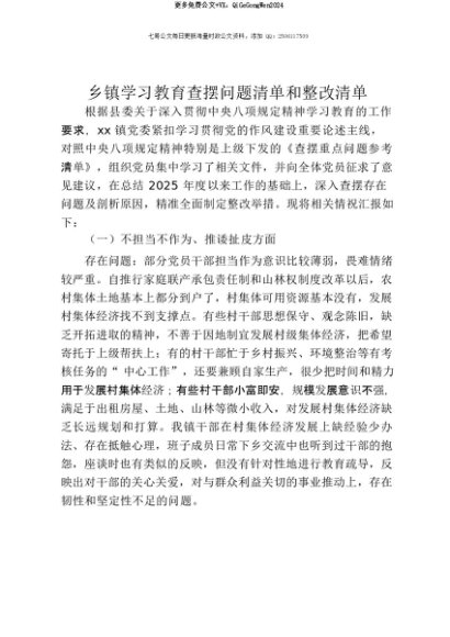 【七哥公文】2025年:【七哥公文】乡镇贯彻中央八项规定精神学习教育查摆问题清单和整改清单+更多免费公文+VX:QiGeGongWen2024+更多免费公文+VX:QiGeGongWen2024