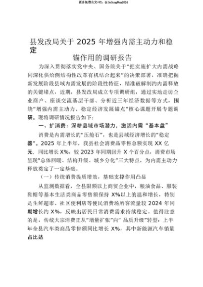 【七哥公文】2025年:【七哥公文】县发改局关于2025年增强内需主动力和稳定锚作用的调研报告_20250815_213025+更多免费公文+VX:QiGeGongWen2024+更多免费公文+VX:QiGeGongWen2024