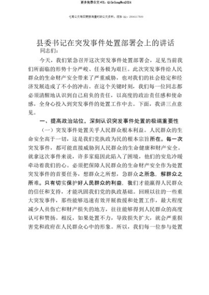 【七哥公文】2025年:【七哥公文】县委书记在突发事件处置部署会上的讲话+更多免费公文+VX:QiGeGongWen2024+更多免费公文+VX:QiGeGongWen2024