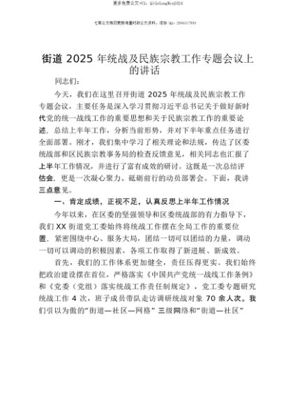 【七哥公文】2025年:【七哥公文】街道2025年统战及民族宗教工作专题会议上的讲话+更多免费公文+VX:QiGeGongWen2024+更多免费公文+VX:QiGeGongWen2024
