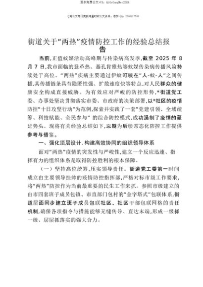 【七哥公文】2025年:【七哥公文】街道关于“两热”疫情防控工作的经验总结报告+更多免费公文+VX:QiGeGongWen2024+更多免费公文+VX:QiGeGongWen2024