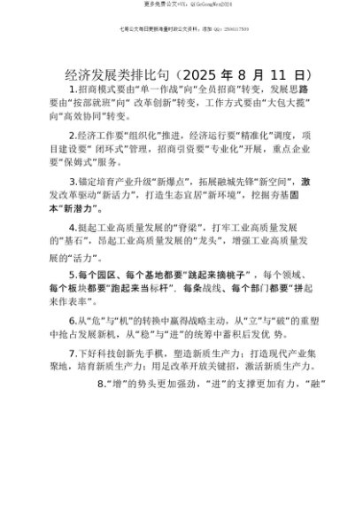 【七哥公文】2025年:【七哥公文】经济发展类排比句(2025年8月11日)+更多免费公文+VX:QiGeGongWen2024+更多免费公文+VX:QiGeGongWen2024