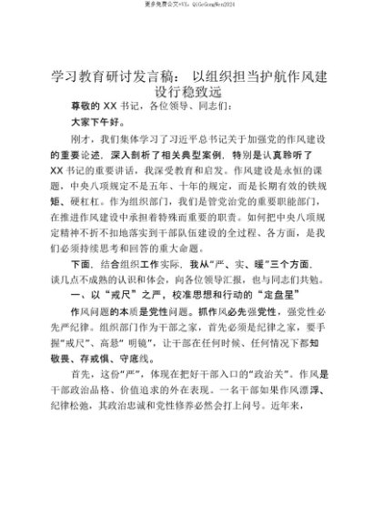 【七哥公文】2025年:【七哥公文】贯彻中央八项规定精神学习教育研讨发言稿:以组织担当护航作风建设行稳致远_20250815_213025+更多免费公文+VX:QiGeGongWen2024+更多免费公文+VX:QiGeGongWen2024