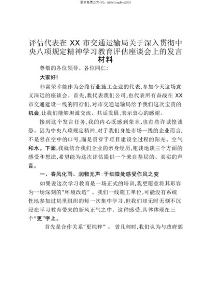 【七哥公文】2025年:【七哥公文】评估代表在XX市交通运输局关于深入贯彻中央八项规定精神学习教育评估座谈会上的发言材料_20250815_213025+更多免费公文+VX:QiGeGongWen2024+更多免费公文+VX:QiGeGongWen2024