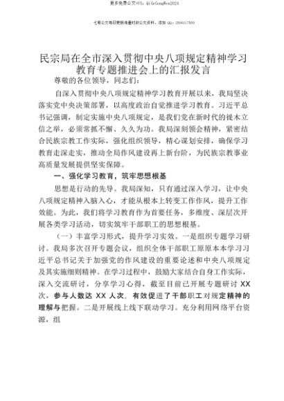【七哥公文】2025年:【七哥公文】民宗局在全市深入贯彻中央八项规定精神学习教育专题推进会上的汇报发言+更多免费公文+VX:QiGeGongWen2024+更多免费公文+VX:QiGeGongWen2024