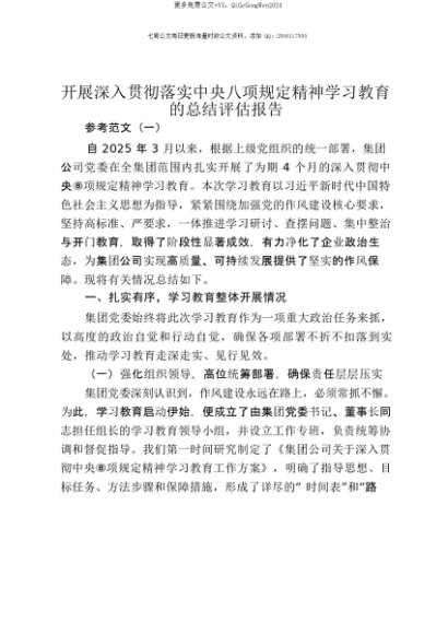 【七哥公文】2025年:【七哥公文】汇编:国有企业开展深入贯彻落实中央八项规定精神学习教育的总结评估报告2篇+更多免费公文+VX:QiGeGongWen2024+更多免费公文+VX:QiGeGongWen2024
