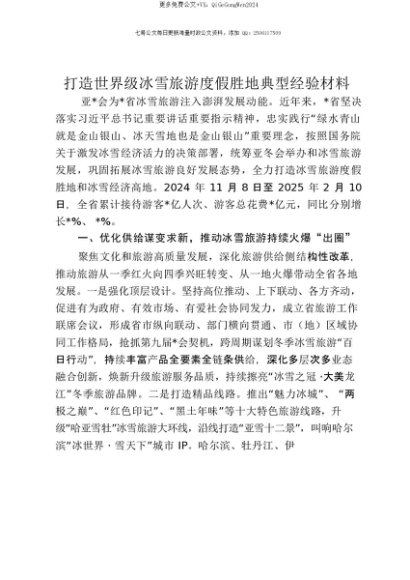 【七哥公文】2025年:【七哥公文】打造世界级冰雪旅游度假胜地典型经验材料+更多免费公文+VX:QiGeGongWen2024+更多免费公文+VX:QiGeGongWen2024