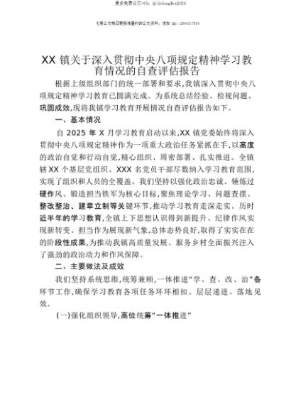 【七哥公文】2025年:【七哥公文】XX镇关于深入贯彻中央八项规定精神学习教育情况的自查评估报告+更多免费公文+VX:QiGeGongWen2024+更多免费公文+VX:QiGeGongWen2024