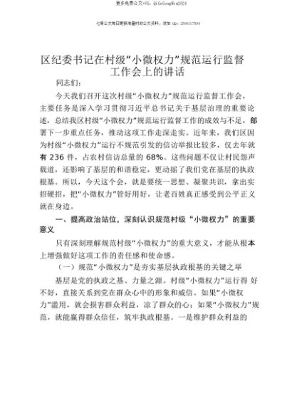 【七哥公文】2025年:【七哥公文】区纪委书记在村级“小微权力”规范运行监督工作会上的讲话+更多免费公文+VX:QiGeGongWen2024+更多免费公文+VX:QiGeGongWen2024