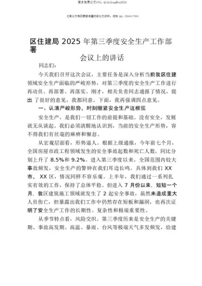 【七哥公文】2025年:【七哥公文】区住建局2025年第三季度安全生产工作部署会议上的讲话+更多免费公文+VX:QiGeGongWen2024+更多免费公文+VX:QiGeGongWen2024
