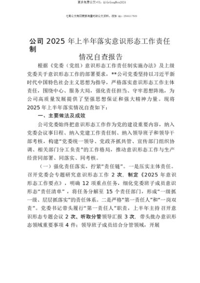 【七哥公文】2025年:【七哥公文】公司2025年上半年落实意识形态工作责任制情况自查报告+更多免费公文+VX:QiGeGongWen2024+更多免费公文+VX:QiGeGongWen2024