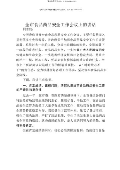 【七哥公文】2025年:【七哥公文】全市食品药品安全工作会议上的讲话+更多免费公文+VX:QiGeGongWen2024+更多免费公文+VX:QiGeGongWen2024