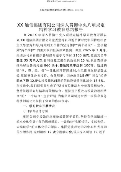 【七哥公文】2025年:【七哥公文】XX通信集团有限公司深入贯彻中央八项规定精神学习教育总结报告+更多免费公文+VX:QiGeGongWen2024+更多免费公文+VX:QiGeGongWen2024