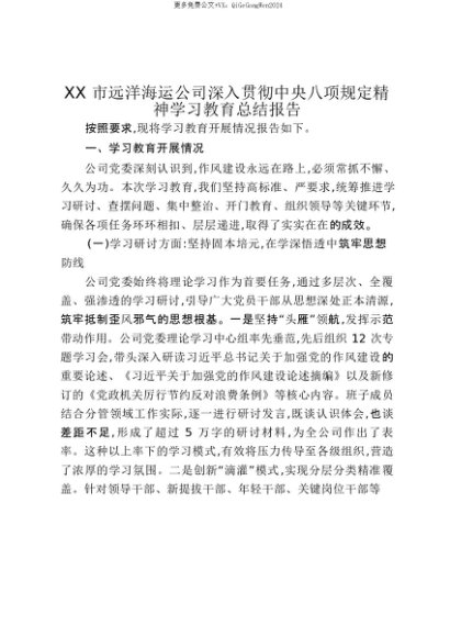 【七哥公文】2025年:【七哥公文】XX市远洋海运公司深入贯彻中央八项规定精神学习教育总结报告_20250815_213024+更多免费公文+VX:QiGeGongWen2024+更多免费公文+VX:QiGeGongWen2024
