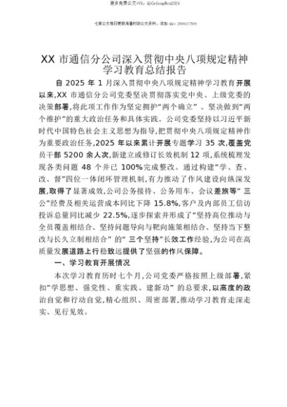 【七哥公文】2025年:【七哥公文】XX市通信分公司深入贯彻中央八项规定精神学习教育总结报告+更多免费公文+VX:QiGeGongWen2024+更多免费公文+VX:QiGeGongWen2024
