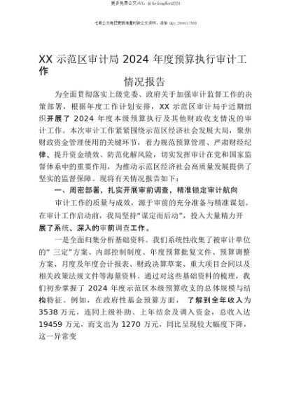 【七哥公文】2025年:【七哥公文】XX示范区审计局2024年度预算执行审计工作情况报告+更多免费公文+VX:QiGeGongWen2024+更多免费公文+VX:QiGeGongWen2024