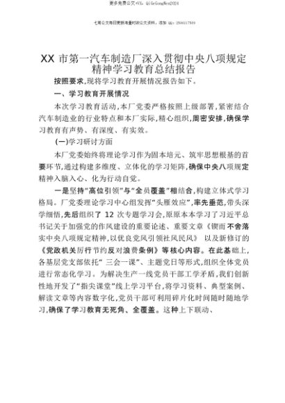 【七哥公文】2025年:【七哥公文】XX市第一汽车制造厂深入贯彻中央八项规定精神学习教育总结报告+更多免费公文+VX:QiGeGongWen2024+更多免费公文+VX:QiGeGongWen2024