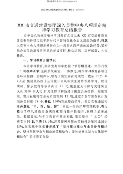 【七哥公文】2025年:【七哥公文】XX市交通建设集团深入贯彻中央八项规定精神学习教育总结报告+更多免费公文+VX:QiGeGongWen2024+更多免费公文+VX:QiGeGongWen2024