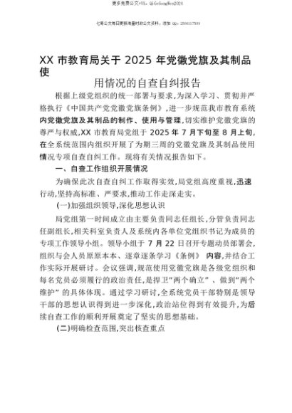 【七哥公文】2025年:【七哥公文】XX市教育局关于2025年党徽党旗及其制品使用情况的自查自纠报告+更多免费公文+VX:QiGeGongWen2024+更多免费公文+VX:QiGeGongWen2024