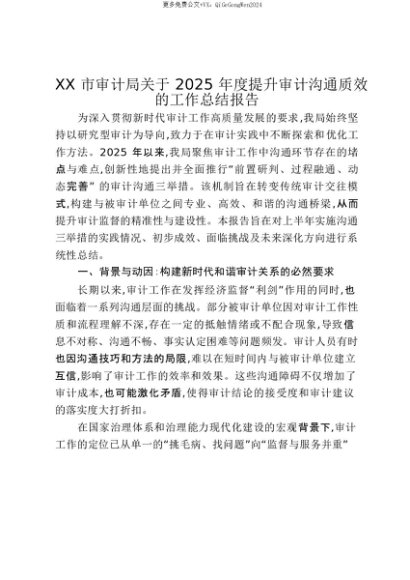 【七哥公文】2025年:【七哥公文】XX市审计局关于2025年度提升审计沟通质效的工作总结报告_20250815_213024+更多免费公文+VX:QiGeGongWen2024+更多免费公文+VX:QiGeGongWen2024