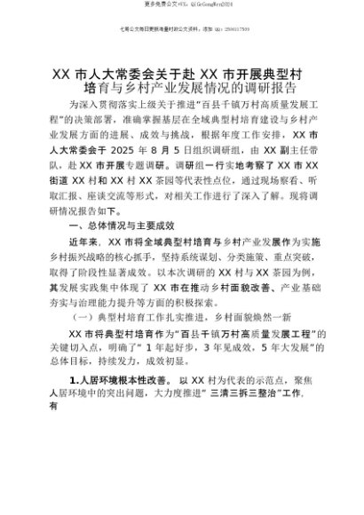 【七哥公文】2025年:【七哥公文】XX市人大常委会关于赴XX市开展典型村培育与乡村产业发展情况的调研报告+更多免费公文+VX:QiGeGongWen2024+更多免费公文+VX:QiGeGongWen2024