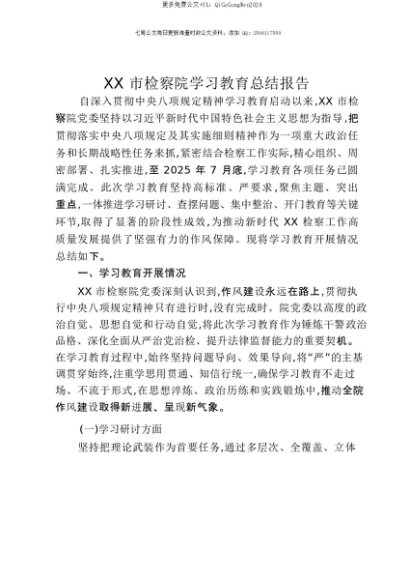 【七哥公文】2025年:【七哥公文】XX市检察院贯彻中央八项规定精神学习教育总结报告+更多免费公文+VX:QiGeGongWen2024+更多免费公文+VX:QiGeGongWen2024