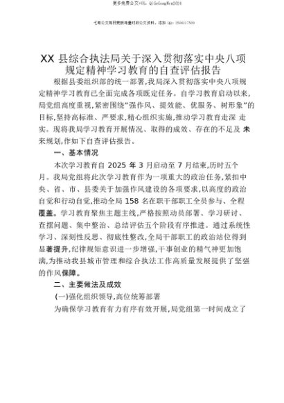 【七哥公文】2025年:【七哥公文】XX县综合执法局关于深入贯彻落实中央八项规定精神学习教育的自查评估报告+更多免费公文+VX:QiGeGongWen2024+更多免费公文+VX:QiGeGongWen2024