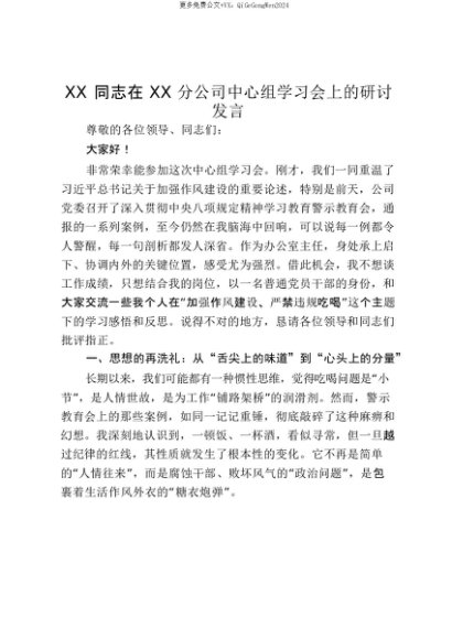 【七哥公文】2025年:【七哥公文】XX同志在XX分公司中心组学习会上的研讨发言_20250815_213024+更多免费公文+VX:QiGeGongWen2024+更多免费公文+VX:QiGeGongWen2024