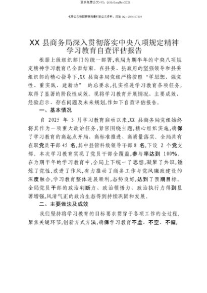 【七哥公文】2025年:【七哥公文】XX县商务局深入贯彻落实中央八项规定精神学习教育自查评估报告+更多免费公文+VX:QiGeGongWen2024+更多免费公文+VX:QiGeGongWen2024