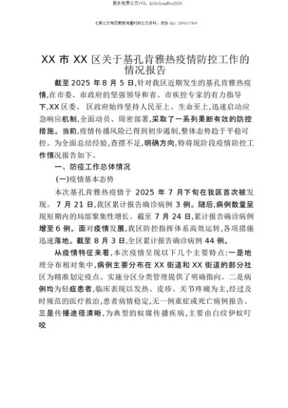 【七哥公文】2025年:【七哥公文】XX市XX区关于基孔肯雅热疫情防控工作的情况报告+更多免费公文+VX:QiGeGongWen2024+更多免费公文+VX:QiGeGongWen2024