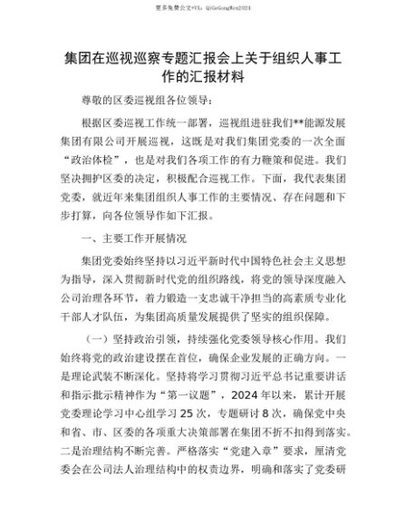 【七哥公文】2025年:【七哥公文】集团在巡视巡察专题汇报会上关于组织人事工作的汇报材料+更多免费公文+VX:QiGeGongWen2024+更多免费公文+VX:QiGeGongWen2024