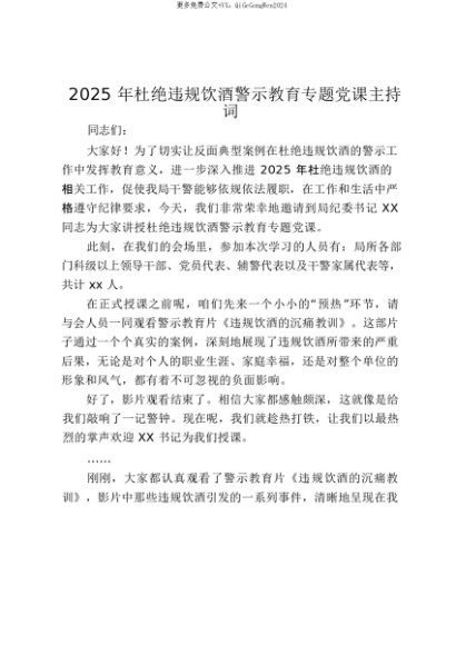 【七哥公文】2025年:【七哥公文】2025年杜绝违规饮酒警示教育专题党课主持词_20250815_213023+更多免费公文+VX:QiGeGongWen2024+更多免费公文+VX:QiGeGongWen2024