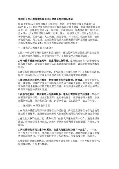 【七哥公文】2025年:【七哥公文】领导班子学习教育群众座谈会征求意见梳理情况报告+更多免费公文+VX:QiGeGongWen2024+更多免费公文+VX:QiGeGongWen2024