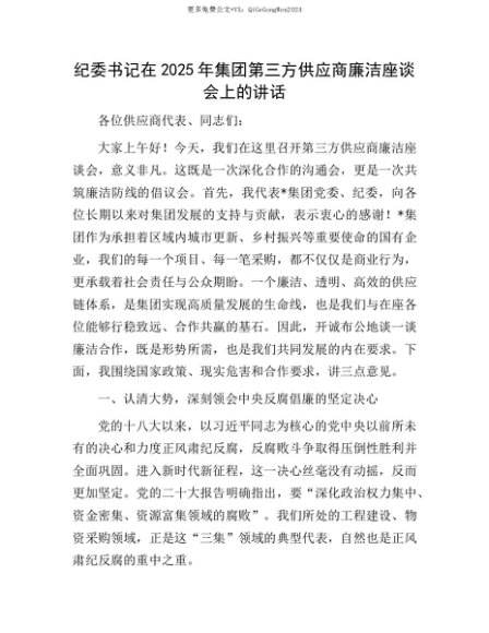 【七哥公文】2025年:【七哥公文】纪委书记在2025年集团第三方供应商廉洁座谈会上的讲话+更多免费公文+VX:QiGeGongWen2024+更多免费公文+VX:QiGeGongWen2024