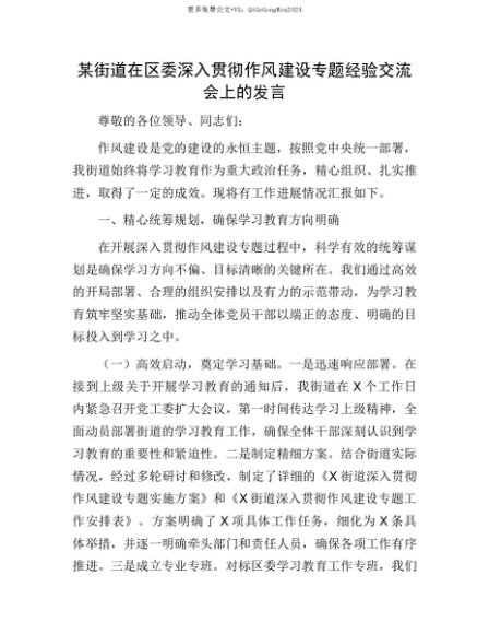 【七哥公文】2025年:【七哥公文】某街道在区委深入贯彻作风建设专题经验交流会上的发言+更多免费公文+VX:QiGeGongWen2024+更多免费公文+VX:QiGeGongWen2024