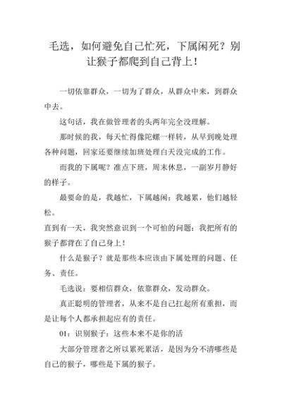 【七哥公文】2025年:【七哥公文】毛选,如何避免自己忙死,下属闲死?别让猴子都爬到自己背上+更多免费公文+VX:QiGeGongWen2024+更多免费公文+VX:QiGeGongWen2024
