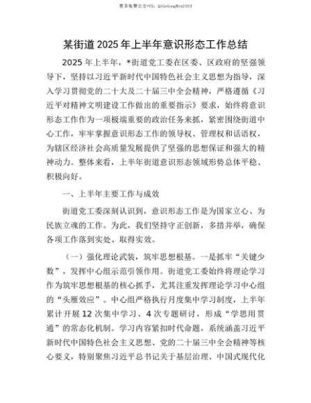 【七哥公文】2025年:【七哥公文】某街道2025年上半年意识形态工作总结+更多免费公文+VX:QiGeGongWen2024+更多免费公文+VX:QiGeGongWen2024