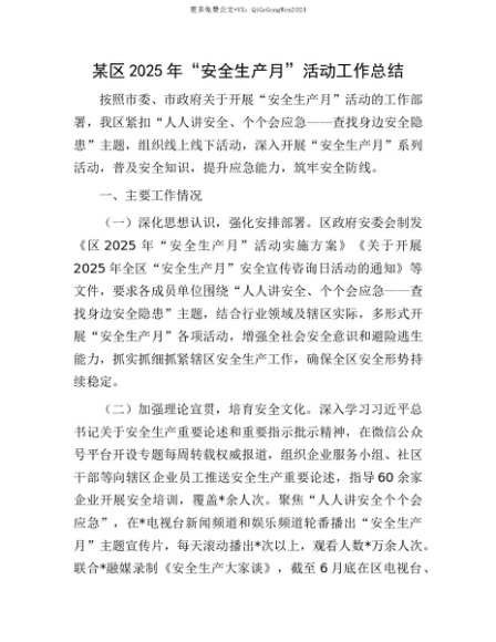 【七哥公文】2025年:【七哥公文】某区2025年“安全生产月”活动工作总结+更多免费公文+VX:QiGeGongWen2024+更多免费公文+VX:QiGeGongWen2024