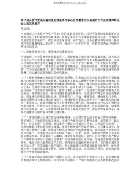【七哥公文】2025年:【七哥公文】班子成员在市交通运输局X组理论学习中心组专题学习中央城市工作会议精神研讨会上的交流发言+更多免费公文+VX:QiGeGongWen2024+更多免费公文+VX:QiGeGongWen2024