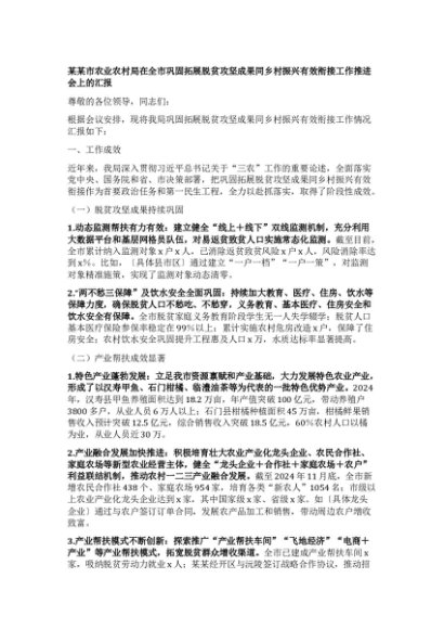 【七哥公文】2025年:【七哥公文】某某市农业农村局在全市巩固拓展脱贫攻坚成果同乡村振兴有效衔接工作推进会上的汇报+更多免费公文+VX:QiGeGongWen2024+更多免费公文+VX:QiGeGongWen2024