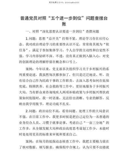 【七哥公文】2025年:【七哥公文】普通X员对照“五个进一步到位”问题查摆台账+更多免费公文+VX:QiGeGongWen2024+更多免费公文+VX:QiGeGongWen2024