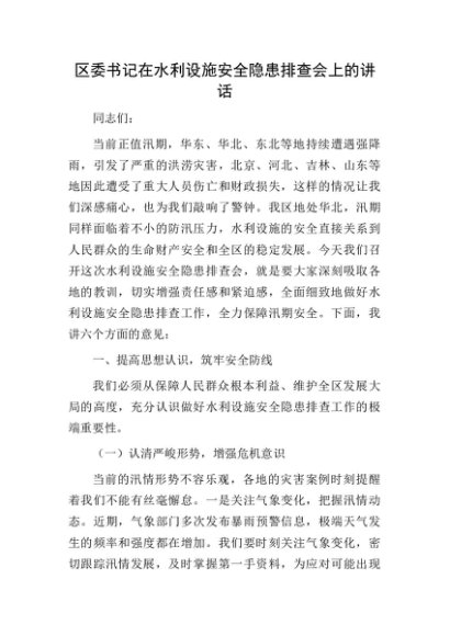 【七哥公文】2025年:【七哥公文】区委书记在水利设施安全隐患排查会上的讲话+更多免费公文+VX:QiGeGongWen2024+更多免费公文+VX:QiGeGongWen2024