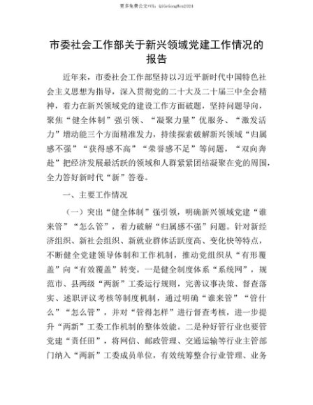 【七哥公文】2025年:【七哥公文】市委社会工作部关于新兴领域X建工作情况的报告+更多免费公文+VX:QiGeGongWen2024+更多免费公文+VX:QiGeGongWen2024