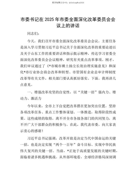 【七哥公文】2025年:【七哥公文】市委书记在2025年市委全面深化改革委员会会议上的讲话+更多免费公文+VX:QiGeGongWen2024+更多免费公文+VX:QiGeGongWen2024