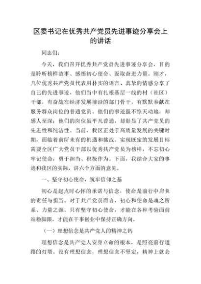 【七哥公文】2025年:【七哥公文】区委书记在优秀共产X员先进事迹分享会上的讲话+更多免费公文+VX:QiGeGongWen2024+更多免费公文+VX:QiGeGongWen2024
