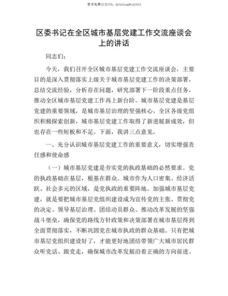 【七哥公文】2025年:【七哥公文】区委书记在全区城市基层X建工作交流座谈会上的讲话+更多免费公文+VX:QiGeGongWen2024+更多免费公文+VX:QiGeGongWen2024
