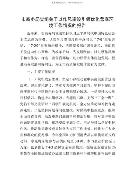 【七哥公文】2025年:【七哥公文】市商务局X组关于以作风建设引领优化营商环境工作情况的报告+更多免费公文+VX:QiGeGongWen2024+更多免费公文+VX:QiGeGongWen2024