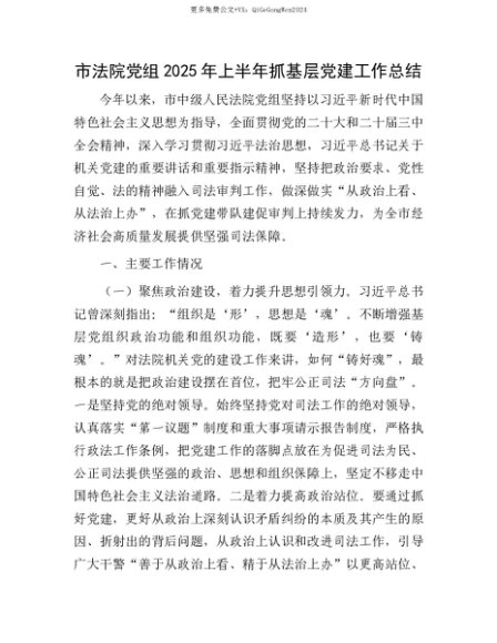 【七哥公文】2025年:【七哥公文】市法院X组2025年上半年抓基层X建工作总结+更多免费公文+VX:QiGeGongWen2024+更多免费公文+VX:QiGeGongWen2024