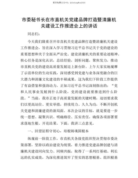 【七哥公文】2025年:【七哥公文】市委秘书长在市直机关X建品牌打造暨清廉机关建设工作推进会上的讲话+更多免费公文+VX:QiGeGongWen2024+更多免费公文+VX:QiGeGongWen2024